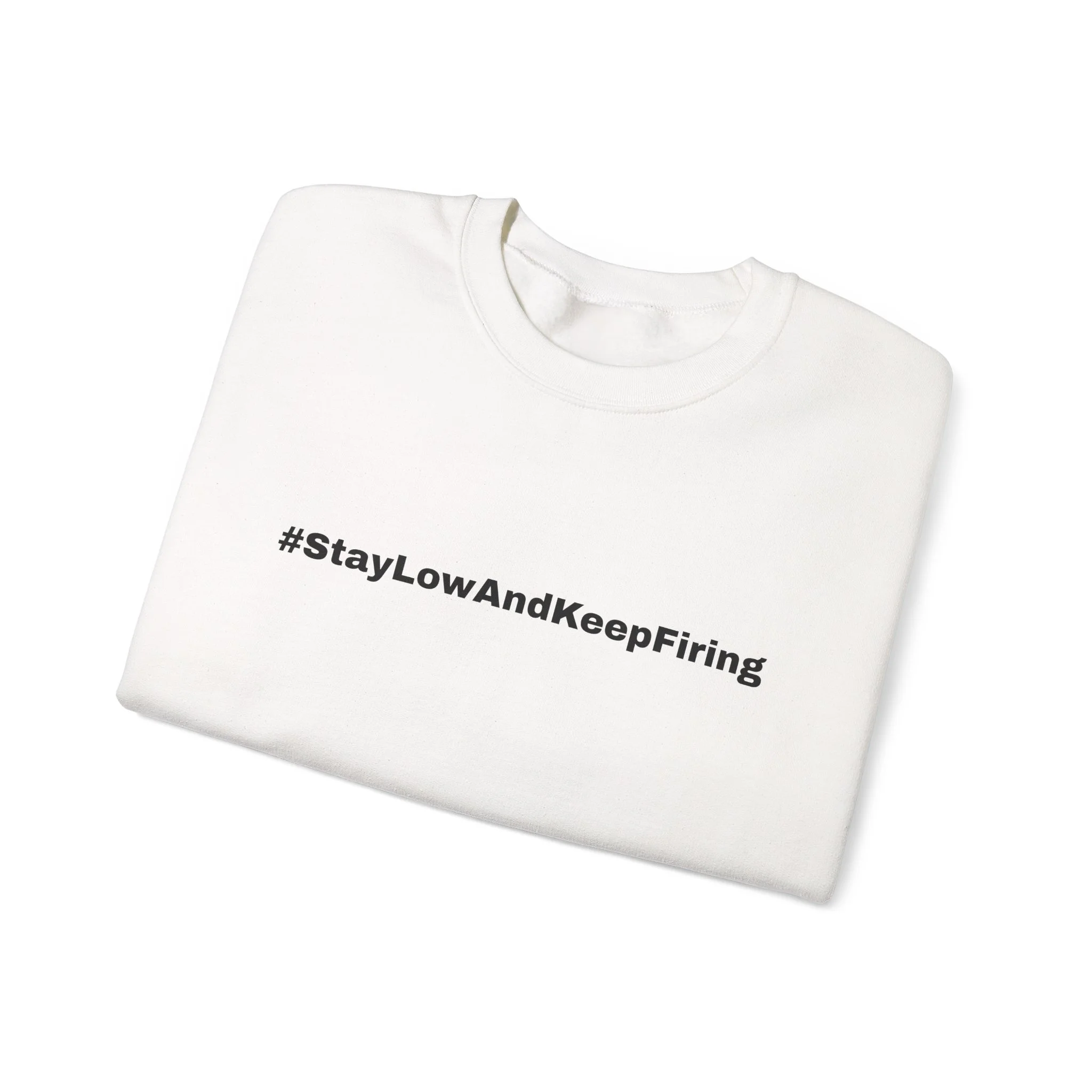 A soft, mid-weight crewneck sweat that feels like a private statement and a slow exhale. The front wears a quiet hashtag—#StayLowAndKeepFiring—while the back shows a grainy, black-and-white photograph that reads like a stolen moment from a late-night watch. It drapes cleanly across the shoulders and holds its shape through repeated wear thanks to ribbed collar and reinforced double-needle stitching. Breathable cotton-poly blend keeps the inside cozy without overheating. Subtle DTF inner labels and optional embroidery placements make this a thoughtfully finished piece built to travel with you through long commutes, late shifts, and weekend vigils.